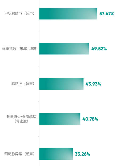 排除与性别相关的前列腺异常(超声)和乳腺结节(超声),甲状腺结节(超声)连续四年成为中国企业家面临的高发健康问题,检出率高达57.47%,往下依次为体重指数(BMI)增高、脂肪肝(超声)、骨量减少/骨质疏松(骨密度)和颈动脉异常(超声),检出率均超过三成。