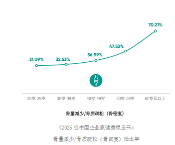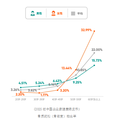 从50岁开始,女性企业家的骨质疏松(骨密度)检出率高于男性,60岁及以上的检出率为32.99%,高于同年龄段男性的2倍,每10人中就有超过3人骨头变“脆”,与这一年龄段的女性雌激素水平缺乏有关。