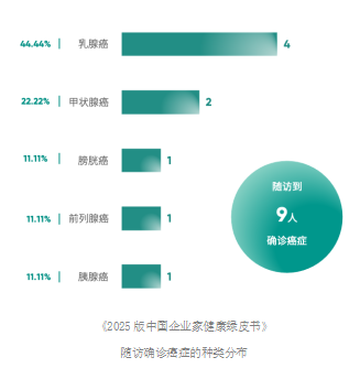 绿皮书显示,2024年10月1日至2025年9月30日期间,在爱康体检的1.18万位中国企业家中,爱康已随访到9人确诊癌症,其中,乳腺癌4人,甲状腺癌2人,膀胱癌、前列腺癌、胰腺癌均为1人。由于存在部分企业家在爱康提醒后未进一步到医院检查,从而无法确认是否患癌,以及到医院进一步就诊后确认患癌,但未反馈到爱康的情况。因此,实际确诊的癌症患者数量有可能高于这个数字。