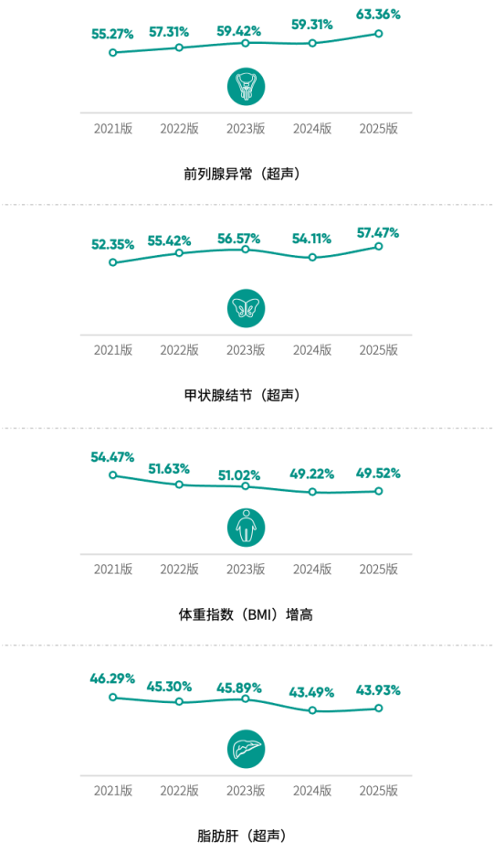 对比可见,前列腺异常(超声)、甲状腺结节(超声)、体重指数(BMI)增高和脂肪肝(超声)连续五年检出率均超过四成。此外,乳腺结节(超声)检出率连年走高;甘油三酯(TG)增高、宫颈异常(妇科检查)、幽门螺杆菌检测(呼气试验)阳性、糖化血红蛋白(HbA1c)增高和高血压连续五年检出率呈逐年下降趋势。建立健康的生活方式并合理用药将有助于这些异常指标的进一步改善。