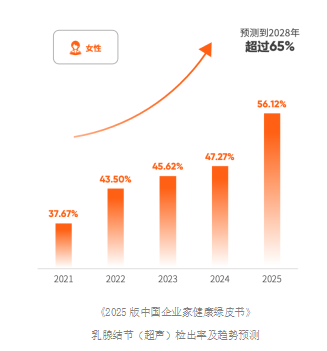 乳腺癌早期可能表现为乳腺结节。绿皮书显示,女性企业家的乳腺结节(超声)检出率为56.12%,较去年增加8.85%,预测到2028年,检出率将超过65%,如今,40岁-49岁这个年龄段已经率先逼近这一数字,检出率为64.41%,需要特别关注乳腺健康。