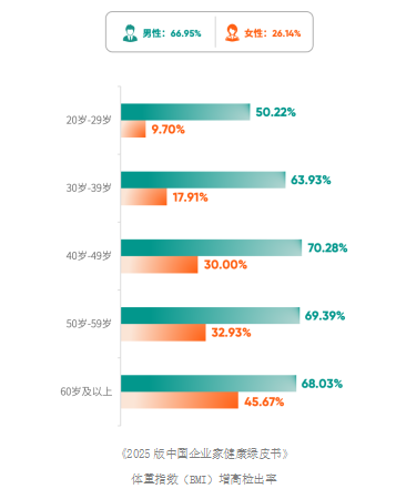 男性企业家最难逃的是“发福魔咒”,66.95%的体重指数(BMI)增高检出率是女性的2.56倍,且在各个年龄段的检出率均超过五成,并高于女性。