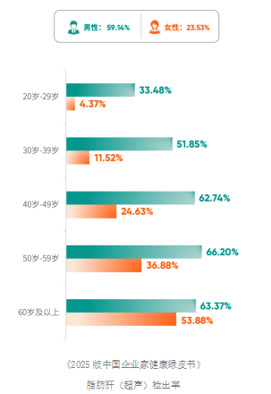 常年辗转于饭局酒桌之间,企业家除了愈发“稳重”,肝脏也在悄悄变得“油腻”。绿皮书显示,各个年龄段男性企业家的脂肪肝(超声)检出率均高于女性企业家,其中,50岁-59岁的检出率超过66%,需要引起重视。