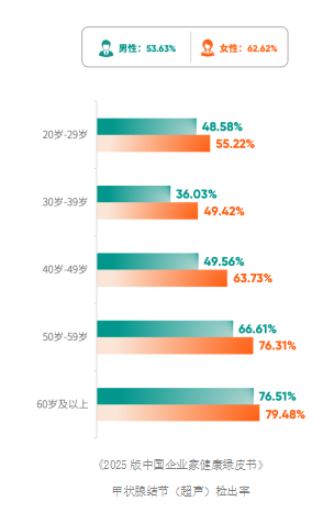 除了乳腺疾病,越来越多的女性被甲状腺疾病“盯”上。绿皮书中确诊甲状腺癌的企业家均为女性,此外,女性企业家的甲状腺结节(超声)检出率为62.62%,且在各个年龄段的检出率均高于男性。