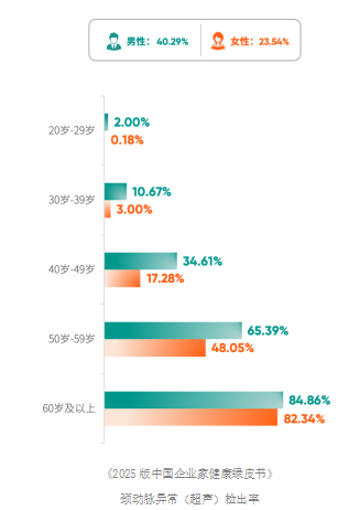 临床观察表明,骨质疏松症经常与颈动脉粥样硬化发生在同一患者身上③。绿皮书显示,企业家的颈动脉异常(超声)检出率在50岁-59岁这个年龄段狂飙至58.88%,60岁及以上有接近84%的人颈动脉亮起“红灯”。此外,各个年龄段男性企业家的检出率均高于女性企业家。